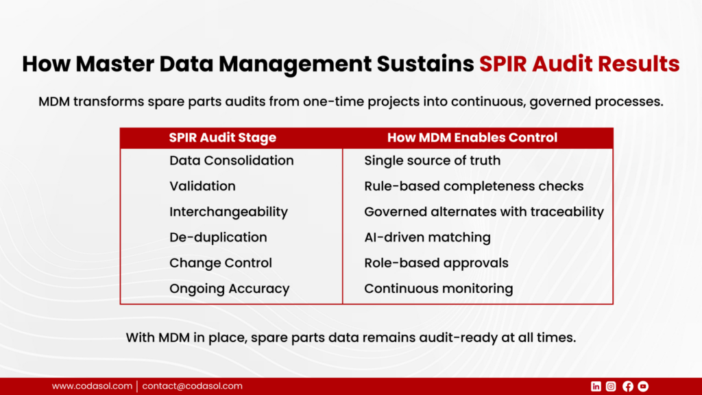 An MDM-led approach ensures spare parts data remains accurate, audit-ready, and reliable, transforming it from a recurring operational risk into a long-term business asset.